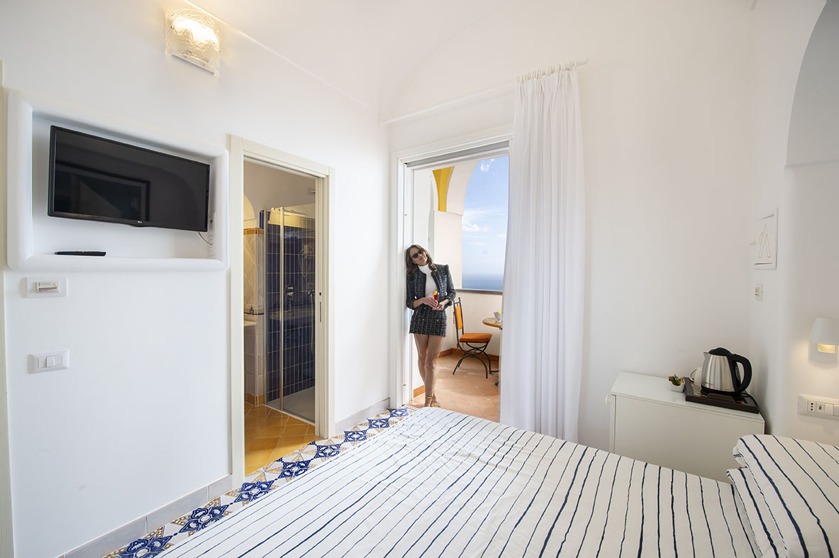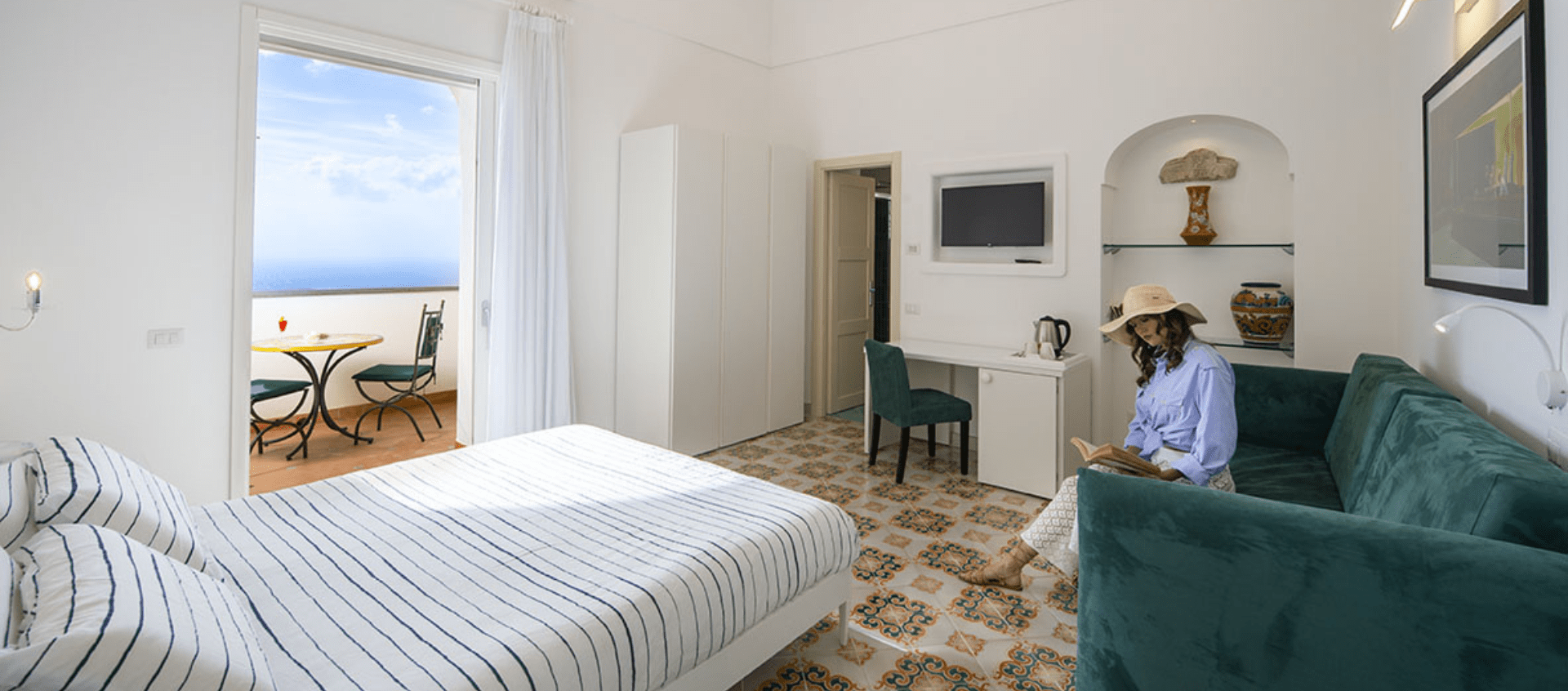 Dive into the blue sea of the Amalfi Coast without ever leaving your room. The view from this comfortable bedroom will leave you speechless and is a perfect experience to share with a special person. It is furnishing with Mediterranean-style pieces and features ornate floors with hand-painted tiles from Vietri sul Mare.