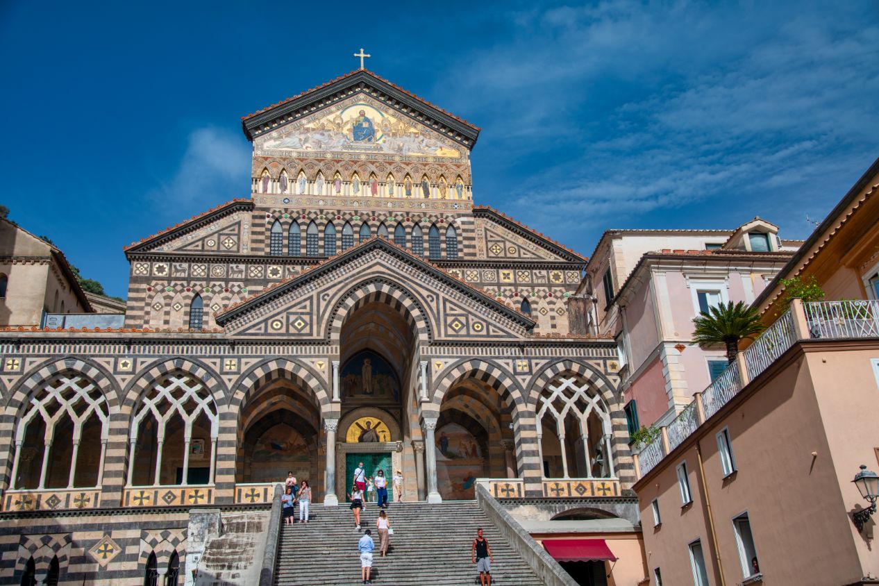 Tra le attrazioni imperdibili della Costiera Amalfitana non potevamo non menzionare il Duomo di Amalfi, noto anche come Cattedrale di Sant’Andrea. Il maestoso complesso architettonico è costituito da due costruzioni un tempo distinte: la cattedrale edificata a partire dal 987 accanto all’antica Basilica del Crocifisso (in cui è allestito dal 1996 il Museo Diocesano) eretta nel IX secolo. All’esterno presenta una colorata facciata impreziosita da un ricco mosaico rappresentante Cristo in trono in mezzo agli Evangelisti mentre l’interno, contraddistinto da forme barocche, conserva pregevoli tele risalenti ai secoli XVII-XVIII e sculture marmoree e lignee di varie epoche. A completare il capolavoro ci sono: la scenografica scalinata, set fotografico di innumerevoli turisti; la Cripta di Sant’Andrea, decorata da splendidi affreschi, in cui sono custodite le reliquie del santo; e il Chiostro del Paradiso, che rappresenta uno dei maggiori esempi del romanico amalfitano.