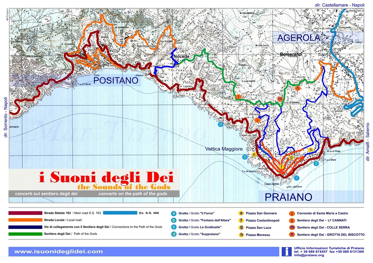 Per raggiungere le varie location è prevista ogni volta un’escursione a piedi, di livello medio e della durata compresa tra un’ora e mezza e tre ore, con partenza da Praiano, Agerola o Positano. Le esibizioni si tengono sul sagrato della Chiesa di Santa Maria a Castro, accanto al Convento di San Domenico (a quota 364 metri sul livello del mare), in località “Li Cannati” (537 metri) e in località “Colle Serra” (578 metri), tutti punti da cui si possono ammirare splendide vedute panoramiche.