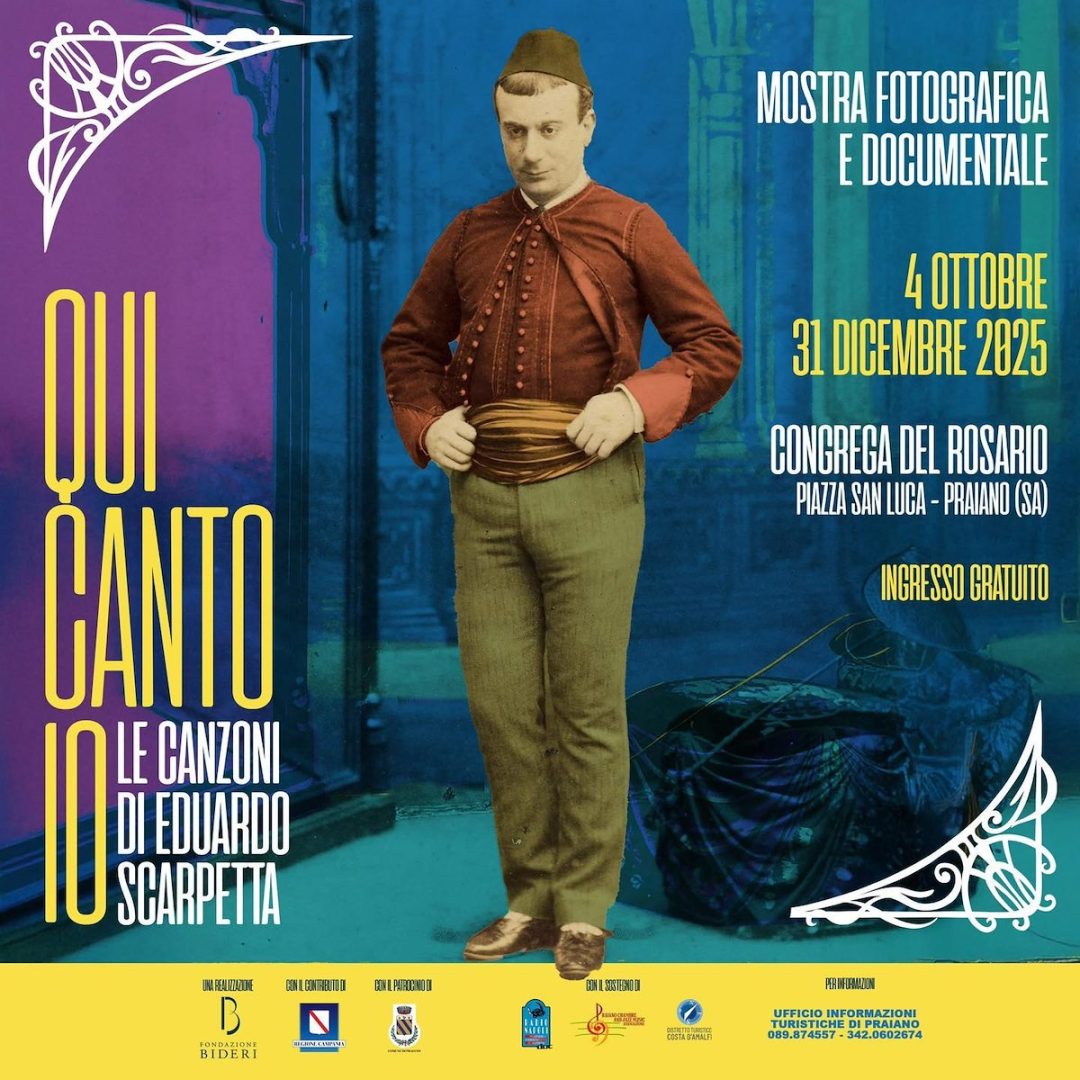 From 4 October to 31 December 2025, the charming 17th-century chapel of the Congrega del Rosario in Piazza San Luca in Praiano will host the exhibition ‘Qui canto io’ (Here I sing), which explores Eduardo Scarpetta’s little-known role as a writer of verses composed to become songs. The most important actor and author of Neapolitan theatre between the late 19th and early 20th centuries, he was also a prolific songwriter. The exhibition, promoted by the Bideri Foundation with the scientific advice of the Istituto del Dramma Napoletano directed by Mariano d’Amora, represents the first systematic survey of Scarpetta’s vast songbook: 214 songs, 54 of which were written for non-theatrical purposes, often focusing on the theme of love.