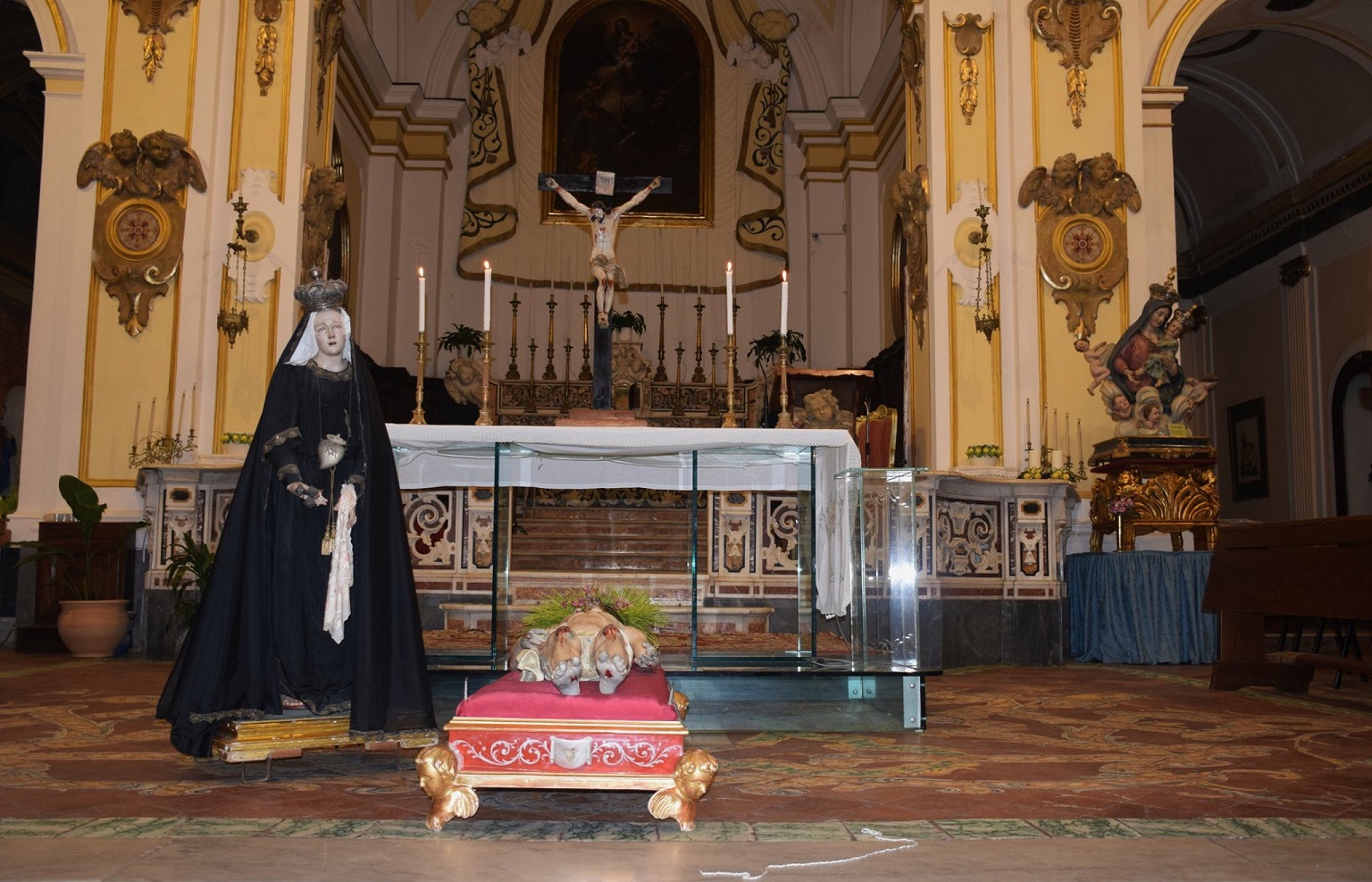 Among the church’s rich artistic heritage, the following are worth mentioning: the precious polychrome marble balustrade, the altar frontal of the Rosary altar and the high altar; a silver bust of the patron saint dating back to the 17th century; a canvas depicting the Circumcision of Jesus, by Giovanni Bernardo Lama, a well-known local painter of the 16th century; the painted panel of Our Lady of the Rosary, created by Padovano De Montorio in 1572; a painting depicting the Immaculate Conception by the Neapolitan school painter Silvestro Buono; and two 18th-century organs, also from the Neapolitan school.
