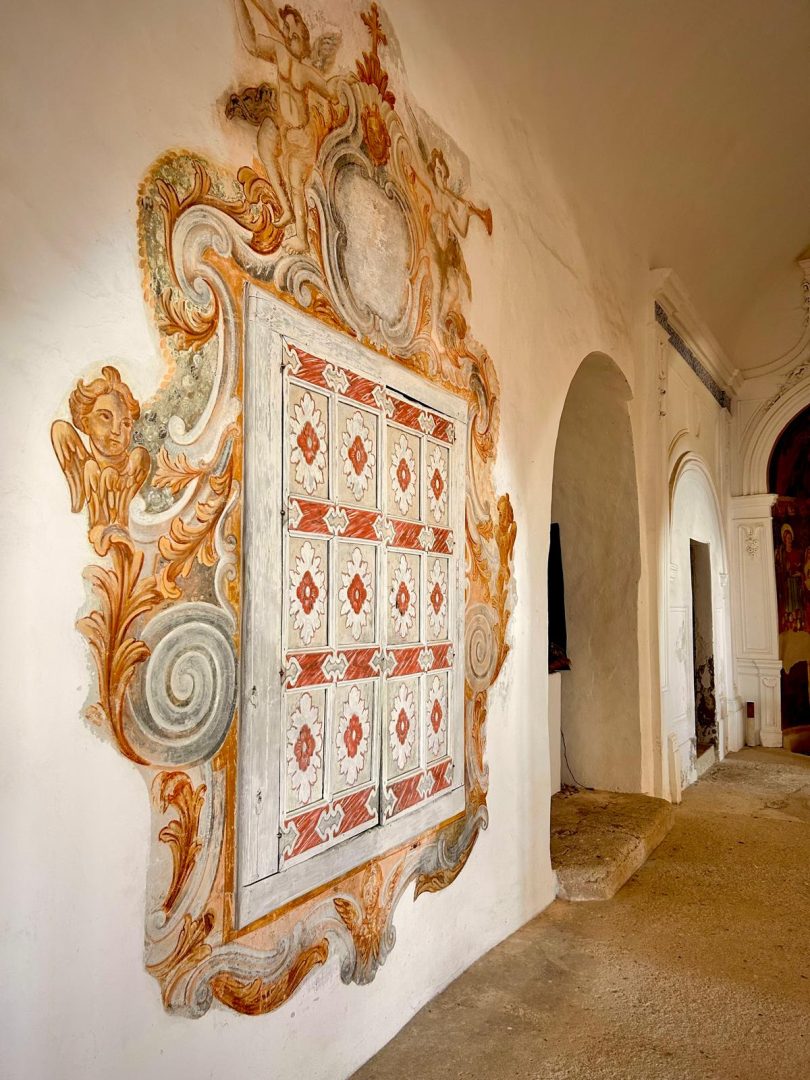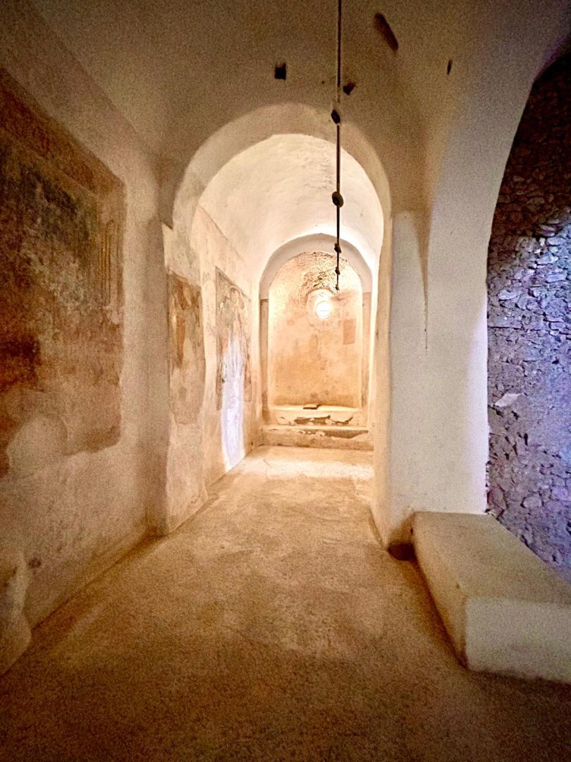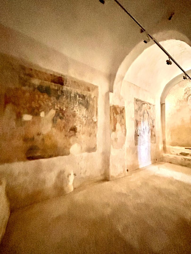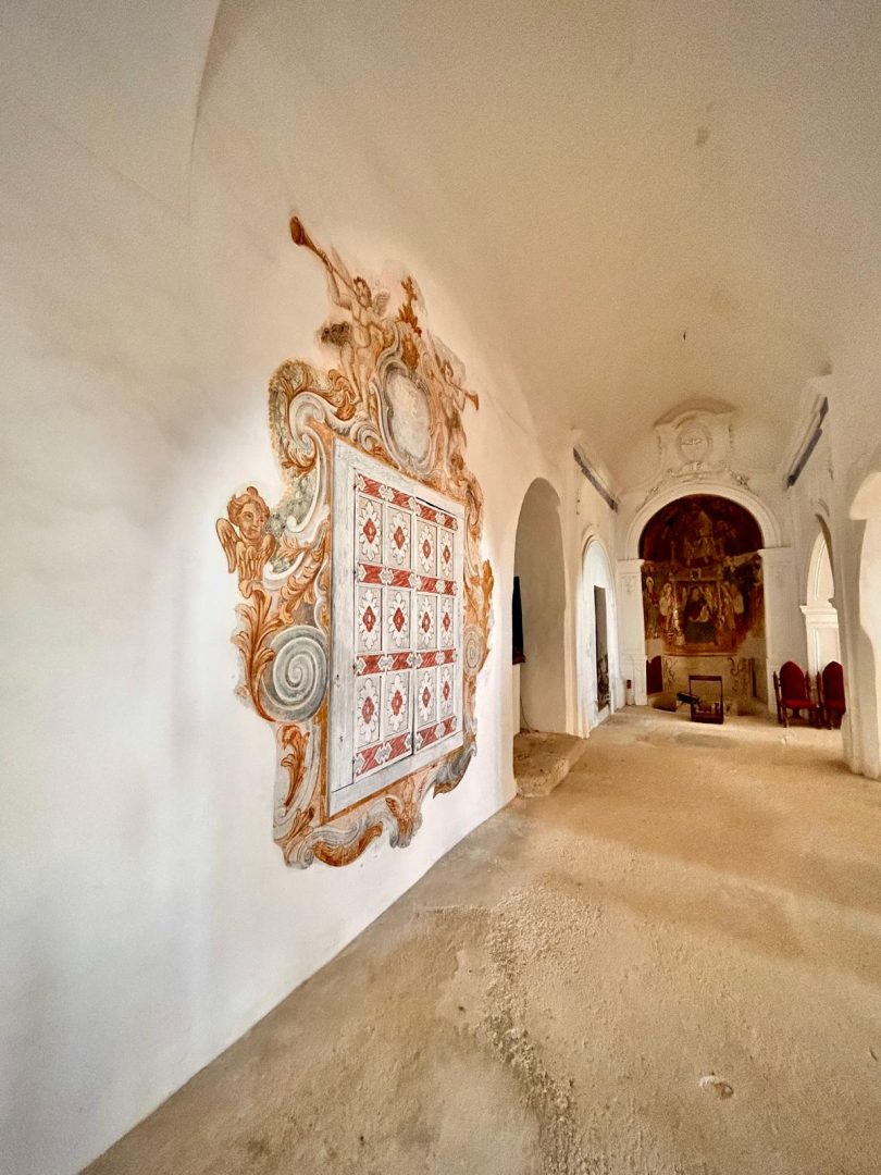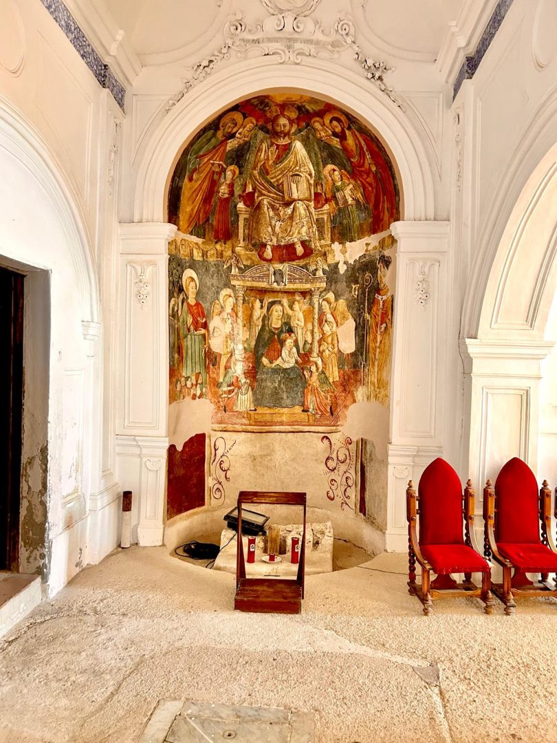 Santa Maria a Castro is the only church on the Amalfi Coast with five naves (built in various stages). Inside, for centuries an image commonly known as the Madonna delle Grazie has been venerated for the thaumaturgic value it has always been given. It is a precious fresco painting preserved in the apsidal area of the left aisle. The work has two orders: the upper register is occupied by the hieratic image of the Blessing Christ, of clear Byzantine derivation, flanked by the figures of Saints Peter and Paul and angels; the lower part by the enthroned Virgin and Child, framed in a canopy and surrounded by angels and saints. Scholars have pointed out that the fresco, although anonymous, reveals an artistic personality immersed in the cultural climate of Renaissance southern Italy.