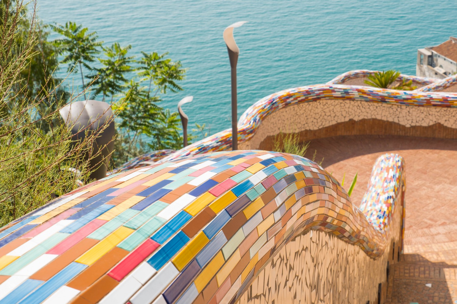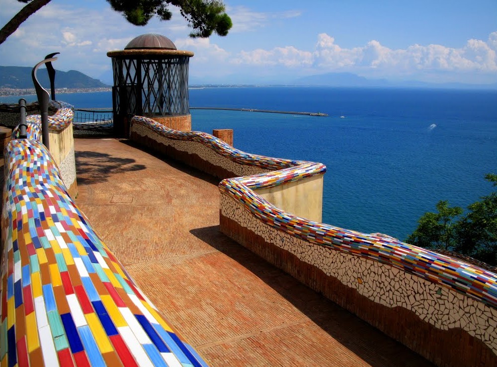 This enchanting place is where the art of ceramics—an art form that has made Vietri famous worldwide—blends harmoniously with the beauty of the Mediterranean landscape. Low walls, handrails, fountains, and benches are entirely covered in colorful Vietri majolica tiles, turning every corner into an elegant artistic composition. The result recalls the prestigious Park Güell by Antoni Gaudí in Barcelona. The comparison is no coincidence: both places share an aesthetic vision that places beauty at the service of public space, transforming an ordinary walk into a rich visual and sensory experience.