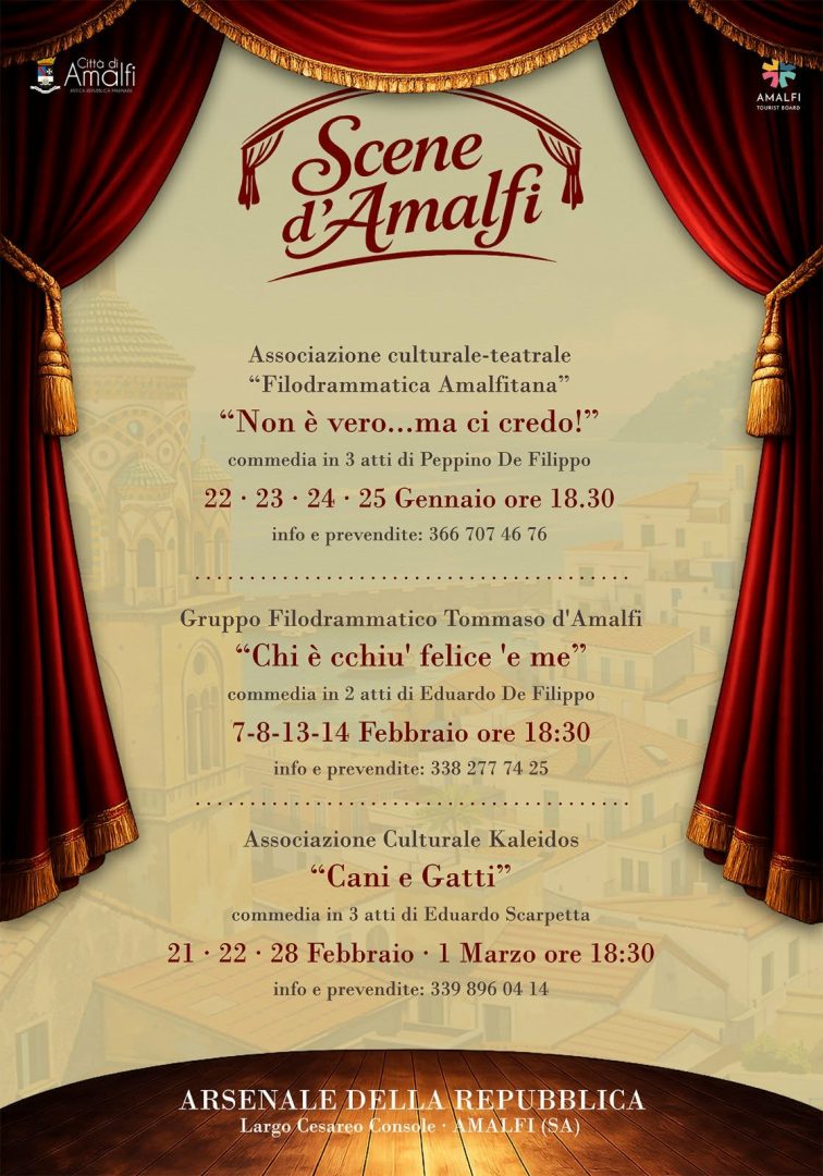 From January 22 to March 1, the Arsenal of the Republic of Amalfi will host the first edition of the theatrical festival “Scene d’Amalfi“. Promoted by the Municipality in collaboration with local theater companies, it offers a journey through the great classics of Neapolitan theater, signed by Peppino De Filippo, Eduardo De Filippo and Eduardo Scarpetta.